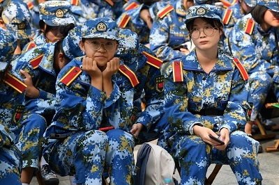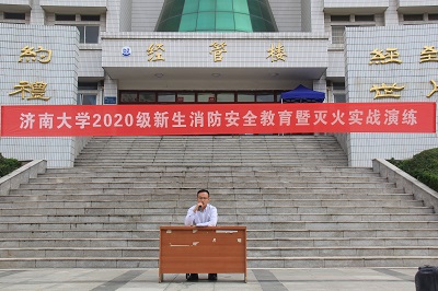 舜耕校区经管楼广场举办消防实战活动,全体2020级新生参与其中。